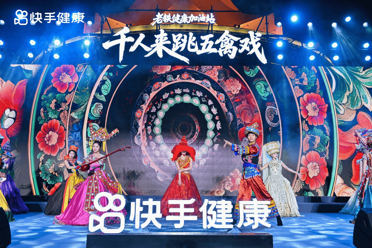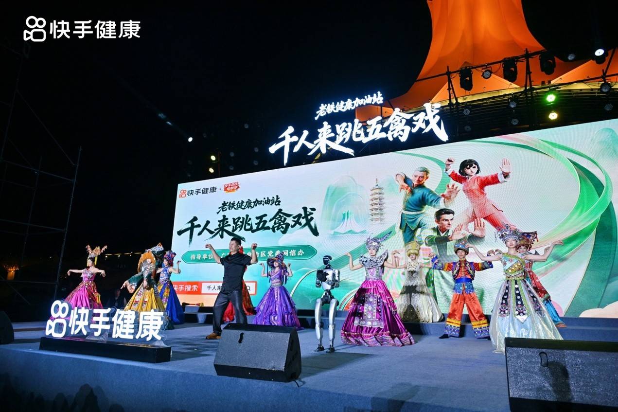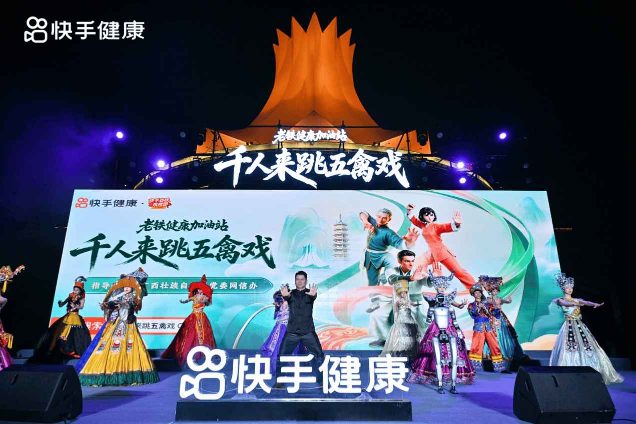 活动开场便将氛围拉满,广西民族舞团身着壮族特色盛装,吹奏芦笙等民族乐器,穿插壮乡原生态山歌清唱,还原了最纯粹的民俗烟火气,让现场观众沉浸式感受传统文化的魅力。随后快手健康达人@德康张刚佑身着壮族服饰登场,伴着山歌旋律与现场观众互动,正式拉开活动序幕。他带领舞团完整演绎五禽戏,每一个动作都彰显中式养生精髓,承载着非遗传承的深厚底蕴。